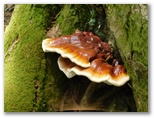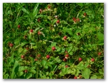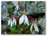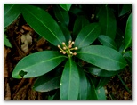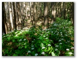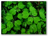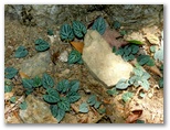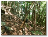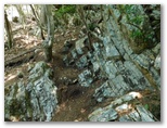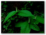 鞍部まで約70mの標高差を下ります。その下り始め、可愛らしいイワウチワの小群落がいくつかありました。この花の咲く季節には、花に目を奪われてあまり葉を見ませんが、真っ直ぐ突き上げる葉柄の先端に、団扇のように円い小さな葉が付き、その葉脈がきれいです。ベゴニアのような赤銅色を帯びた葉もあります。フラッシュ撮影したら、イワカガミのように葉が照り輝きました。この葉でしっかり光合成をして、来春に可憐な花を咲かせてくれることでしょう。