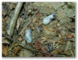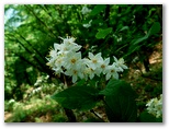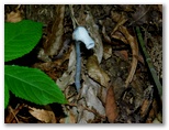 鞍部から約140mの標高差を登り返します。見上げると大変そうにも思えますが、ちょっと裏山に登るようなもの。ここで声援を送ってくれる白い花は、マルバウツギとガクウツギ。地表に頭を出したギンリョウソウ。いや、もしかしたら、これは繭かカプセルで、地球に送られた、宇宙人の落し子なのかも(ウソ)。変な物語を考えているうちに高度を稼ぐと、また壊れた道標がありました。南から合わさる尾根には、通せんぼの枝が置かれています。ここは迷いなく右折。