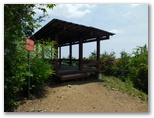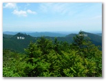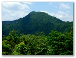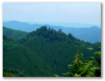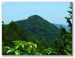 10時50分、予定より大きく遅れて、高岩山に到着しました。養沢神社から高岩山まで、地図に書かれたコースタイムは80分ですが、その1.5倍かけて歩いて来たことになります。もし80分で登って来たら、今頃は暑さでへばっていたかも知れません。高岩山頂にあまり展望はありませんが、大岳山の偉容は望めました。立ったまま、ゆっくりと水分補給をします。そして上高岩山に向かって踏み出すと、行く手の高みに小さく、赤い展望台が見えました。