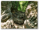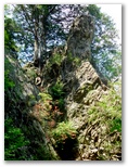 やせた岩稜に差しかかると、立ち木と露岩が道を塞いでいました。巻くと危なそうなので、木と岩の間をすべり抜けます。この道のここかしこに赤いヤマツツジ。見上げれば、豊かに繁る緑の葉。葉と葉の重なりがつくる光と影。尾根を頻繁に行き交う黒い大型の蝶は、モンキアゲハとミヤマカラスアゲハ。ずいぶんと多いです。この色鮮やかな初夏の山にいるのは、私だけ? この日のサルギ尾根は、人の影も声も足跡もなく、倒伏した道標は落ち葉に埋もれたままでした。