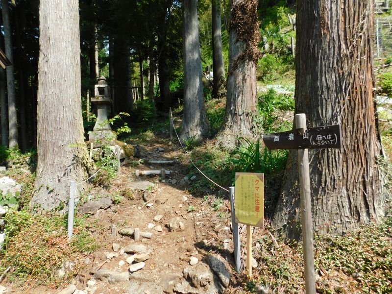 -- 境内の右奥に高岩山登山口。8:56