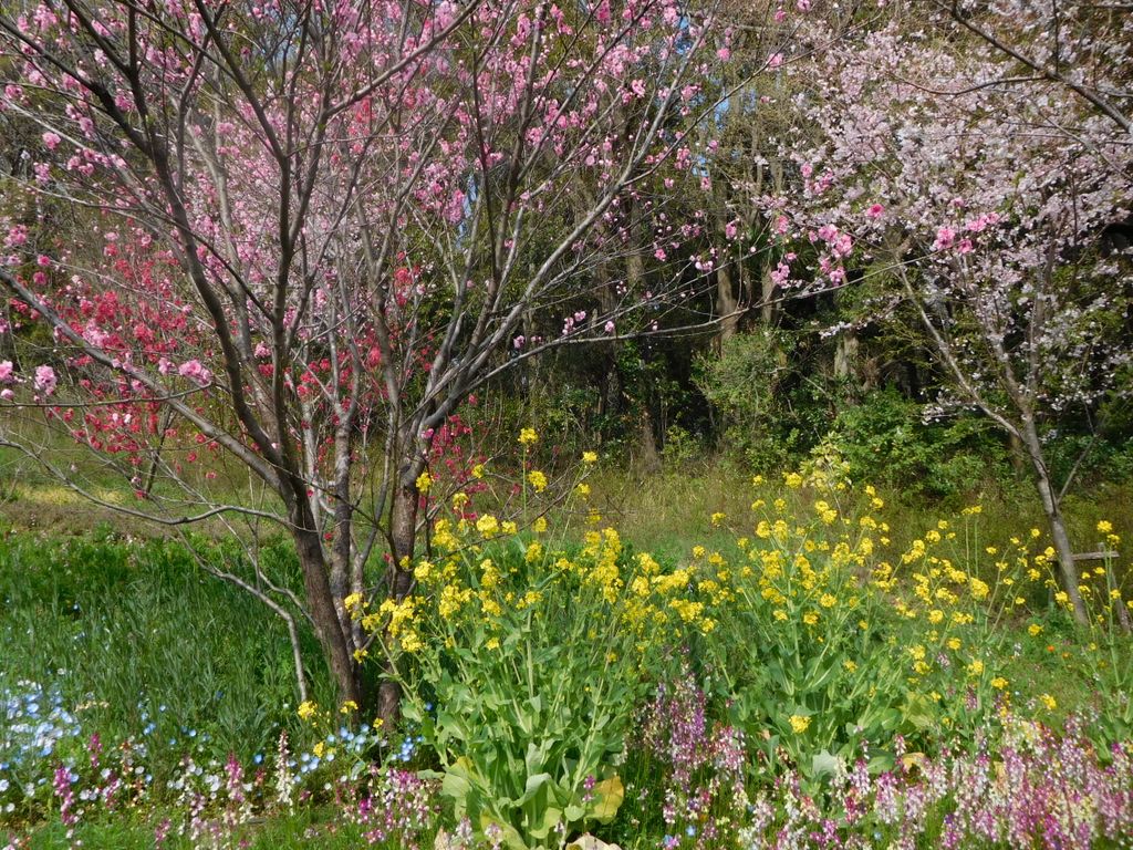 -- ハナモモ、菜の花、キンギョソウ、他。
