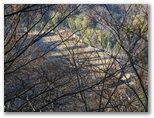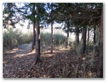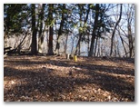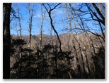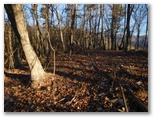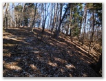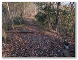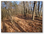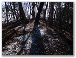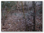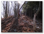 登山道に入って、墓地を見下ろす地点まで登ると、葛野川の流れる風景が、さらに素敵に見えました。上の写真がそれです。もう少し日が高く昇れば、明るい風景になるでしょう。小和田を登山口に選んでよかった!と、つくづく思いました。これより、今立っている尾根をどんどん登ればいいはず。と思ったら、道を塞ぐように通せんぼの枝が置かれていました。でもその左に、登山道らしい道があります。この道に入って行くと、左手に竹林がありました。