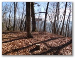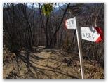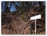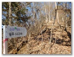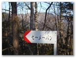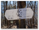 サクラ沢峠の先を10分ほど登り返して、高ノ丸に到着。昼どきなので、ちょっと一休み。私製の山名標が立ち木に結び付けてありますが、釘を生きた木に直接打ってないのは好ましいと思いました。念のため地図を広げて、進むべき方向を確認すると、道は高ノ丸の東南東の尾根です。電子コンパスで針路の東南東を正確に見定め、その尾根を下って行くと、すぐに鉄塔8号でした。さらに7号、6号と続き、小さな石仏の手前から左のプラ階段を降りて、トズラ峠に立ちました。