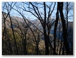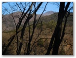 向山では、東面にすばらしい展望がありました。これまで何度も見えていながらも、繁る樹木で展望の苦しかった、権現山稜、扇山、百蔵山などが、今すっきりと望めます。視線を北に向け、来た道を振り返ると、梢越しに7基の鉄塔を数えることができました。このように展望に優れる向山ですが、その先では急階段が待っていました。安全第一、足を取られないよう、慎重に下って行きます。きょうは計画に大きなゆとりがある上に、バスの時刻を気にしなくていいのです。