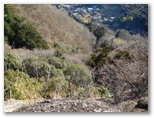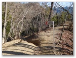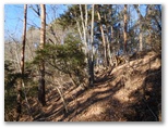 ところが、ちゃんと歩けたのは始めのうちだけで、すぐに道形が不明瞭になり、どこを歩いたらよいのか分からなくなりました。「道が荒れちゃったんだなあ」と思っていたのが、「道間違いだ」と気づいたときは、相当に進んだ後でした。すぐに引き返すべきでしたが、この悪路を戻るのも嫌だと思い、上の尾根に逃げました。その尾根を歩いて、送電線巡視路に戻ることができたのですが、これにより約15分のタイムロス。強引に攀じ登ったので、体力も消耗しました。