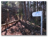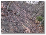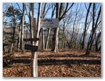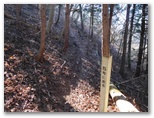トズラ峠は小さな広場状になっていて、岩殿山を指す道標がありました。その広場の奥にも道標があり、笹平を指しています。ここで送電線巡視路のプラ階段を登るよう、目印の赤テープがあったのですが、「5号に至る」と書かれた巡視路の杭を見て、プラ階段を見落としてしまいました。赤テープと杭とが鉄塔5号への道を示していると思い込んだ私は、間違ってその先のトラバース道に進んだのです。その道は落ち葉に埋もれてはいましたが、ちゃんと歩けました。