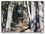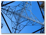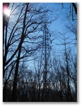 セーメーバンでの休憩を終え、南へと尾根を下ります。まずはじめに出合うのが、深城線送電鉄塔13号。尾根の真ん中ではなく、少し右わきに立っています。周囲を木々に囲まれているので、外からはよく見えません。そこで、四つの脚の中心点から真上を見上げ、鉄骨が織りなす美しい幾何学模様を鑑賞します。この位置には特殊な電界と磁界とがあり、ラジオなど電子機器や方位磁針が必ずしも正しく働きません。一部の鉄塔マニアは「電磁結界」とか「結界」と呼びます。