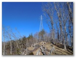 大展望地から、下方の鉄塔10号を見渡せます。この伐採地は、送電線の通り道に十分な空間を確保するためのものだと思いますが、防火帯を兼ねているのかも知れません。きょうの歩行ルートでは、ここ鉄塔11号から10号に至る区間の展望が圧巻でした。反時計回りに山名を列挙すると、雁ヶ腹摺山、黒岳から滝子山への連嶺、富士山とその前衛、鹿留山と御正体山、道志山塊と秋山山稜、丹沢山塊、百蔵山と扇山、権現山稜です。なお、鉄塔9号は、鉄塔10号から望めました。