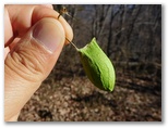 稚児落しの外れに、大月駅への下降点を示す道標がありました。でもその先に要注意箇所がいくつもあって、全く気を抜けません。鎖場もありました。さらにまた断崖の岩尾根を通過。やはりここは強風の日には歩きたくない、ちょっと特別なハイキングコースです。そしてまもなく登山道が終わろうとするところで、山との別れを惜しみつつ紅茶とおやつを楽しんでいると、ランナー風の熟年男性に追いつかれました。今朝バスを降りて以来、初めて出会う人です。