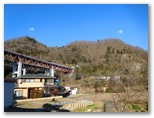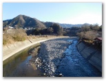 田無瀬で下車し、カラになったバスを見送りました。回れ右をすると、そこはY字路。向かって左は今来た道。右は国道139号で、これから行く小和田への道です。緩やかな坂道を上って行くと、すてきな風景がありました。白く光る葛野川、両岸にたたずむ集落、その彼方には道志の山並みが、滑らかなサインウェーブを描いています。この絵本のような風景は、四季折々に定点撮影してみたいと思うほど。もし「大月市の美しい川12景」を選ぶとしたら、イチ推しです。