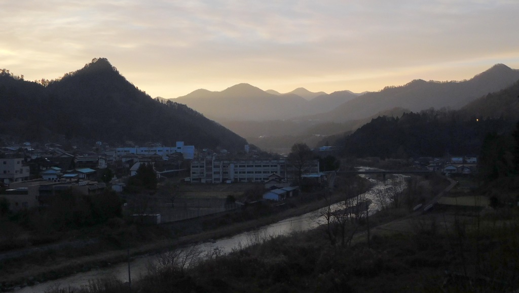-- 田無瀬から望む、早朝の山なみと葛野川。7:15