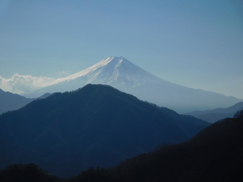 -- ほとんど逆光の富士山。手前は高川山か。13:08