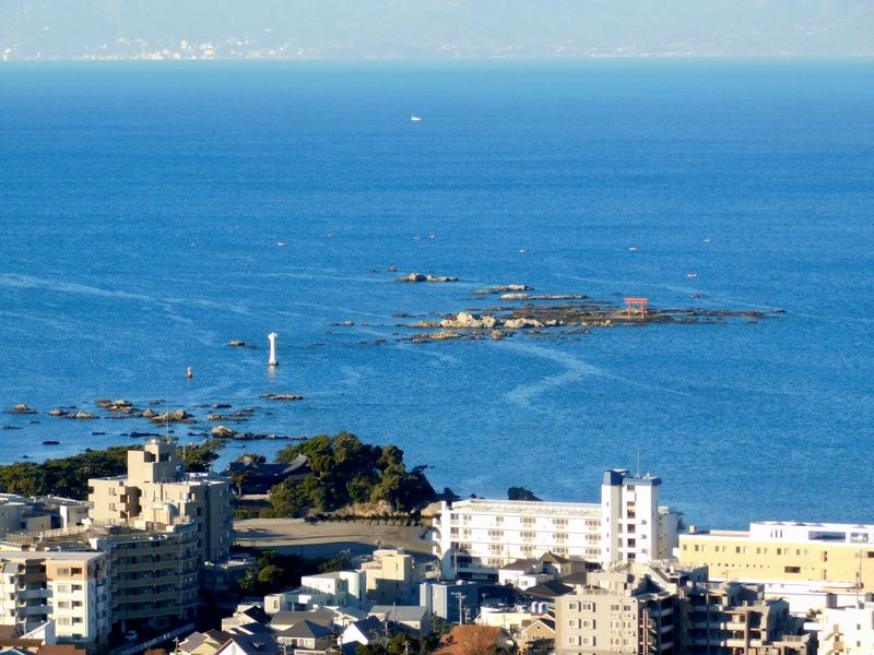 -- 白い葉山灯台、赤い名島(菜島)の鳥居。