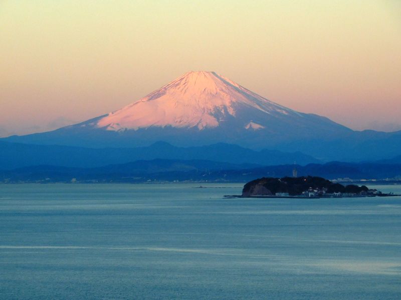 -- 第2号墳より、さくら色の富士と緑の江の島。6:56
