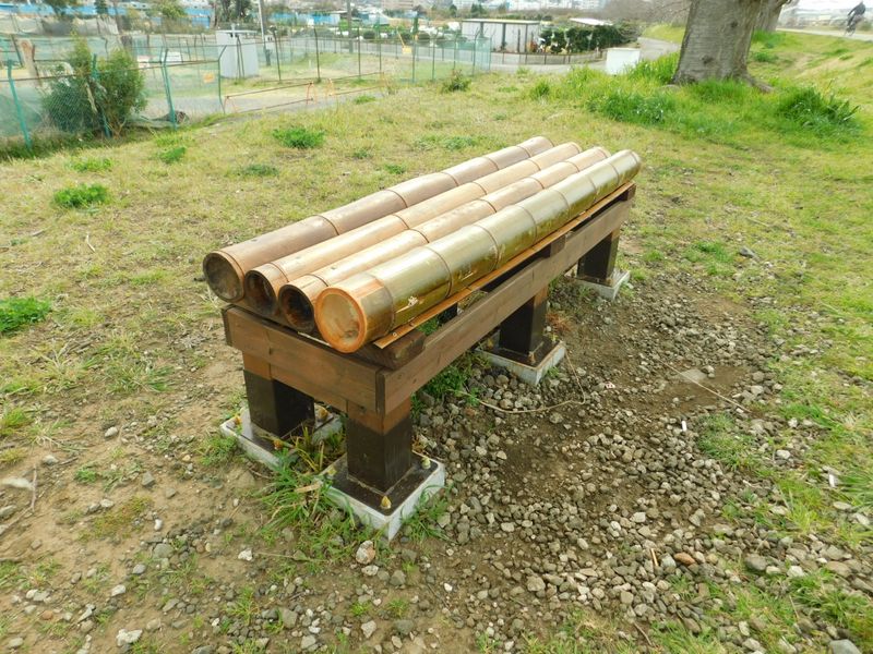 -- 孟宗竹のベンチ。間伐材利用か。14:14