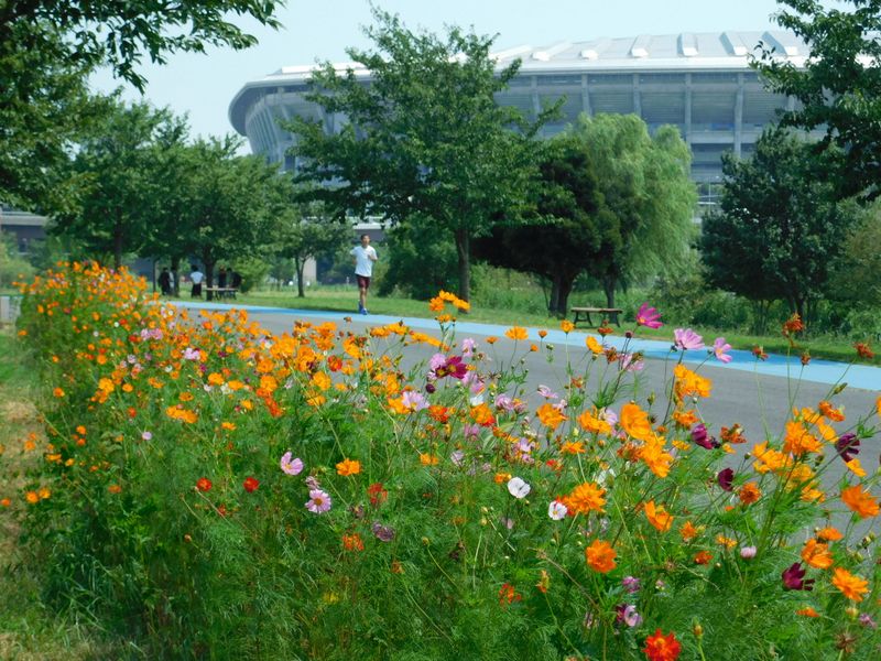 -- コスモス畑と日産スタジアム。