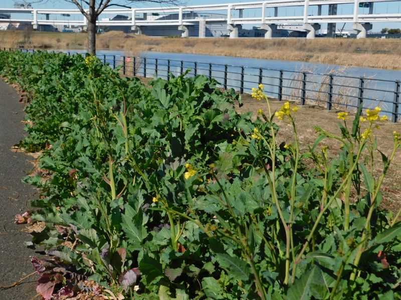 -- 園路沿いに、菜花がずらり。