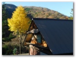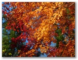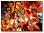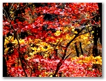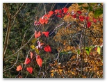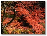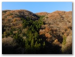 さて、この季節は谷間の林道に日が差すのが遅く、紅葉の色も冴えません。でも左右の山並みから日差しが次第に下がってきて、突然、背中に暖かみを感じ、ものすごい足ながおじさんの影が、足元から前方に投影されました。7時40分。それまで鈍い色合いだったモミジが、お日様マジックでたちまち輝き始めます。林道の左手は、小俣川。かなり深い谷を流れています。右手の山麓にはところどころに家屋が立ち、緩斜面の「準平地」も、わずかながら見られます。