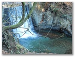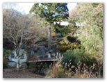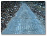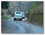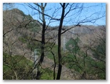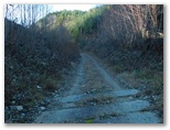 車両ゲートから20分ほどで、林道船窪線の起点に至りました。ここで奈良子線は右に折れ、姥子山の山腹をぐんぐん登っていきます。船窪線も勾配が急で、コンクリート舗装の表面に碁盤の目のような刻みが付いていました。黄色の道路標識は「安全速度 20km/h以下」「落石注意」です。舗装区間はすぐに終わり、土と小石の上に轍がしっかりと固まっていました。ちょっと素敵だと思ったのは、小俣川を越える橋から見た、のどかそうな林間のせせらぎです。
