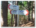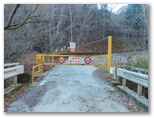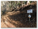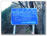 小俣川に容易に出入りできそうな場所もありました。そのすぐ上流で、川が二すじに分かれますが、直進する方が本沢です。林道はここで左にカーブし、本沢を越える橋に(林道起点から)3.5kmと記されていました。この橋を渡ると車両ゲート。「一般車両通行止め」となっていて、鎖と南京錠が掛けられています。ゲートの横をすり抜けて行くと、「恩賜県有林」「山火事注意」などの目立つ看板がありました。奈良子林道は小俣川左俣の右岸沿いに続きます。