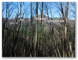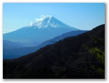 葛野川線11号の真下は緑地化していて、風も防げるので休憩の候補地にはなり得ます。でもその先2~3分で、富士山の見える場所がありました。この時、午前10時17分。すでに小さな雲が富士山頂にかかっていましたが、まもなく雲が増え、逆光になってしまうと予想されました。この富士山展望地は狭く、ベンチなどはありません。昼食は大岱山で取るつもりで、さらに登っていくと、左手の樹木を透かして、白谷ノ丸~雁ヶ腹摺山~姥子山の稜線を望めるようになりました。