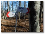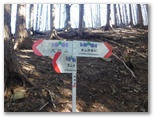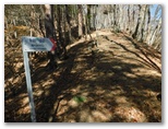 落ち葉の敷き詰められた庭園のような道を、心でルンルン、足でサクサクと歩いていきます。6分ほどで宮地山への分岐点に至りました。道標がかなり黒っぽく汚れているので、次回はスポンジと洗浄剤を持っていきたいところです。さて、その先はプラ階段の急下降ですが、落ち葉の堆積があって、相当に気を遣いました。でも標高差にして約40m下ると、尾根道が緩やかになります。再び♪ルンルン、♪ランラン。深い落ち葉の道も、平坦地では楽しく歩けます。