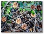 今の季節、どこの山でも似たり寄ったりの状況でしょう。鉄塔11号から10号にかけて、この尾根のハイライトと呼ぶべき好展望が続くのですが、浮かれてはいられません。鉄塔10号を過ぎ、ようやく傾斜が緩くなって一安心と思ったら、ズルズルッと足を取られ、前のめりに転倒してしまいました。幸いそこには落ち葉が分厚く堆積していて、やんわりと私の体を受け止めてくれました。全く無傷で済み、感謝です。踏んだのは丸い枝。持っていた杖は真っ二つに折れました。
