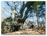 ところで、大岱山山頂標識には「標高1179.8m」と書かれています。ところが、地理院地図ではその地点から北西に約300m離れた地点に、標高1190mの等高線が小さなマルを描いています。そこで今回は、まずその地点に行ってきました。続いて「白ブナ」を表敬訪問します。行くと、木の傍らにちゃんと標識があり「樹齢約三百年」と書かれていました。地面にカメラを置いて記念の自撮りをします。そしてこの白ブナから約50m行くと「大岱山山頂」標識に至りました。
