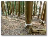 テレビアンテナ用の黒いケーブルが見えると、サクラ沢峠はすぐです。赤く塗られた石祠の脇を通り、サクラ沢峠に到着しました。きょうは安全最優先で、時間を惜しまずに下りてきたので、オプションとして考えてきた高ノ丸には行きません。サクラ沢峠の写真を撮って、すぐに金山民宿村に向かいました。この道の下り始め、道幅の狭いトラバース区間がありますが、3年前と比べて斜面との同化が少し進んだかな、と思いました。と言っても、まだ普通に歩けます。