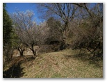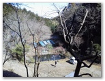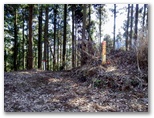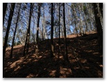 ハイキング道と浅間山林道の交差点で左折します。不動越には行きません。林道を緩く下って行くと、「秦浜線10号に至る」の杭がありました。ここで林道を離れ、右(東)に巡視路を下ります。7分ほどで、10号鉄塔と、伊勢原市街地とが見えました。巡視路は10号の右(南)を回るように付けられています。わずかに下れば、10号鉄塔の足下。そこは樹木に囲まれ、誰にも見られることのない、ひっそりした空間です。塔脚にタッチし、次に進みました。