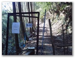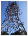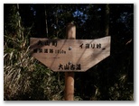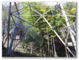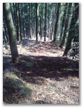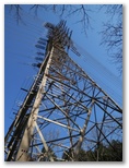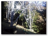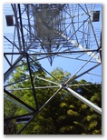 仕事道に戻り、下って行くと、獣除けの柵が道を塞いでいました。「開けたら必ず柵を閉めてしばって下さい」と書いてあるので、そのとおりにします。続いて左に登る小道を分けましたが、実はこれが12号への道でした。私はうっかり通り過ぎ、大山フィッシングセンターで行き過ぎに気付いてUターン。10分ほどの損失で、12号に到着しました。周辺は緑のきれいな竹林です。竹と電球の縁を思いながら、鉄塔の真下より真上に向かって、工学技術の結晶を撮影しました。