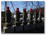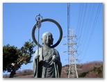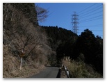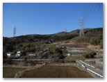 再出発! 今度は神社と寺のある道に入ってみます。すぐに左手に鳥居が見え、「神明社」という扁額がありました。5号鉄塔も見えます。小川の傍に出ると、お寺が見えました。行ってみると、高岳寺といい、門前に立派な六地蔵が立っています。門前に向かって左に上るコンクリートの農道が、地図上の363m点を過る尾根道への入口でしょう。この農道を登って行きます。振り返ると、新秦野変電所から出た送電線と鉄塔の並ぶ里山が、いい風景になっていました。