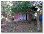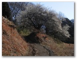 農道はすぐに土の道に変わりました。大きな白梅のわきを通り抜けると、行く手が大きく開けました。ゴルフ場の向こうに高取山と530m峰とが並んでいます。地理院地図では、ここで左折して尾根に向かう道があるのですが、50mほど先で途切れています。行けるところまで行ってみると、みかん畑用のモノレールがありました。これをたどって行くと、藪の中に作業小屋がありました。その左をそっと通り抜け、みかん畑の中のモノレールを辿って行きます。