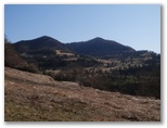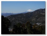 7号から8号へと、巡視路らしい道がありましたが、浅間山(せんげんやま)林道を調べてみたかったので、北東の尾根を登りました。道は特にありませんが、普通に歩けます。7分ほどで浅間山林道に飛び出しました。交点にカーブミラーがあります。西の方に何かありそうなので行ってみると、広大な展望がありました。階段状の岳ノ台南尾根、その向こうに富士山、県道70号の白いガードレール。ヤビツ峠行きのバスで何度も通った尾根を、新しい視点で再発見しました。