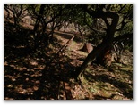 犬がいましたが、私に気が付いて逃げて行きました。そのとき、みかん畑を守る柵の下をくぐって出て行きました。扉があって、開けられますが、紐を解いてまた結ぶのは面倒です。私も下の隙間をくぐりました。柵の外に出ると、目の前に明るい尾根がありました。落ち葉のたくさん積もった、雰囲気のいい尾根です。気分よく尾根を登って行くと、6号鉄塔が見えてきました。大空に悠然と立ち上がり、人の手で与えられた生命感のあるところが、ロボットと似ています。