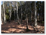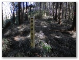 林道はほぼ等高線沿いに、繰り返し尾根と谷とを回り込んで行きます。三番目の谷から、別の林道を右下方に分けました。実はこれが8号鉄塔への近道だったのです。地図を見ていればすぐに分かったことですが、これを怠ったので見逃してしまいました。次の尾根で、「秦浜線8号に至る」と書かれた杭を見て、そこから右に尾根を下りました。巡視路にしては、やや歩きにくかったのですが、すぐに先ほど分岐した林道に降り立ちました。8号鉄塔は目の前です。