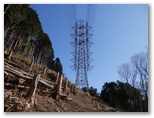 道草はここまでにして、8号鉄塔に向かいます。浅間山林道を東に緩く下って行くと、先の7号鉄塔が見えてきました。高圧線を横から軽く見下ろす位置になりますが、これはちょっと珍しいかもしれません。相模湾の水平線と比べ、送電線もけっこう水平にピンと張っているものだなあと思いました。すべての電線は完璧に平行です。隣り合う電線は張力が同じでないと、強風の時に電線どうし接触するかも知れません。もちろんスペーサーも入っています。
