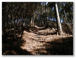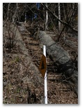8号鉄塔の下には7号への巡視路らしい道がありました。これを使えば近道だったのですが、仕事で来ているわけではありません。お腹もふくれたので、リュックを閉じ、9号に向かいます。8号のすぐ上の林道を、先ほどは横断したのですが、北に上って、浅間山林道に戻りました。再び「秦浜線8号に至る」の杭まで来ると、すぐ先の左手に階段があり、「秦浜線9号に至る」の杭がありました。しっかりした造りで、歩きやすそうな巡視路です。ちょっと登ってみましょう。