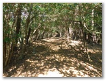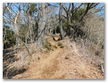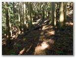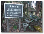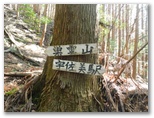 地層のすぐ先に「生仏の墓」なるものがありました。源氏に捕らえられた平家の落武者の悲哀モニュメントです。誰が、いつから「生仏の墓」と呼ぶようになったのでしょうか? ここで登山道と伊豆スカイラインが一旦出合います。目の前の古びた道標に「巣雲山あと少し」と書かれていました。伊豆スカイラインと別れて、明るい尾根を登っていきます。ほどなく、中低木の茂ったトンネルに入りました。常緑広葉樹のイヌツゲが多いようです。
