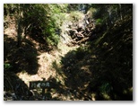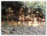 9時36分、ようやく登山口に到着。登山道に入ると、年季の入った道標が幾つか見られ、2か所の沢には新しそうなグレーチング桟橋がありました。杉に中低木の広葉樹が混じる森を登っていきます。地面には杉の落ち葉が積もって、踏む足にフカフカ感がありました。「行者の滝」は辛うじて水が細々と滴っていましたが、大雨が降ればどうでしょうか。この先で「巣雲山地層」を見られます。説明板によると、13万年前に巣雲山が噴火して積もった火山灰の地層だそうです。