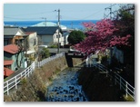 以後、駅まで車道を歩きます。野の花や桜を見ながら、スタコラ下っていきました。時々「展望ひろば」を振り返ります。往路で疑問を抱いた、あのハゲ山は、鮮烈な思い出の丘になりました。茶畑やミカン畑が「ここは静岡県」だと想い起こさせます。やがて、市街地を流れる仲川の先に真っ青な海が見えてきました。この仲川の両岸は、遊歩道のようになっています。二人並んで歩くのは難しそうですが、市街地での車道歩きを避けたいハイカーにはお奨めです。
