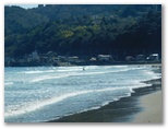 宇佐美駅に到着すると、黒っぽい電車がすべり込んできました。車体に「黒船電車」と書いてあります。車内には窓向きに座っている人々が見えました。これでもLOCAL、普通列車です。私も乗りたいと思いましたが、この電車は伊豆高原行き。残念、逆方向です。熱海行き電車が来るまで20分余りあったので、海岸に行きました。駅から徒歩たった5分で、きれいな浜辺に到着。砂浜に打ち寄せては引いていく波と戯れます。もう海水に手を浸さずにはいられません。