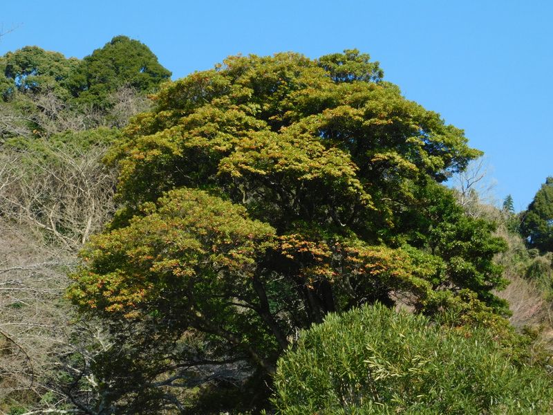 -- 寺の裏手に、紅い新芽を持つ大樹。