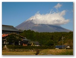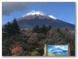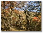 30分ほど降って、雨が上がりました。たちまち青空が戻り、木々が輝き始めます。こんなとき、脳内を流れるのは交響曲「田園」の第五楽章。紅葉・黄葉を愛でながら、軽快に足が進みます。付近に誰もいないのをいいことに、「晩秋の頃」を口ずさみました。♪茜や、金色、落ち葉の道...♪ そして最後にトラロープをまたいで、車道に飛び出しました。水ヶ塚は左方向です。ここで、うれしや、富士山の勇姿! 黒雲は離れつつあり、代わって白い雲が吹き出ていました。
