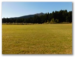 富士山遊歩道を30分ほど歩くと、左手(用沢側)の川岸に沿って、ミニ草原がありました。楽しそうな道なので、ちょっと歩いて見ます。富士山を見上げると、雲の中に小さな円い窓が開き、山頂が少しだけ見えました。雲は山頂よりもずっと手前にあると思われます。やがて遊歩道が終わり、また車道に出ました。そしてまた直ぐ右の森林に入るのですが、右を指す道標に「弁当場」と書かれています。弁当場はきょうのコースの中間チェックポイントです。