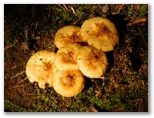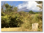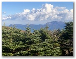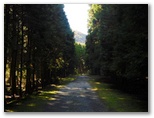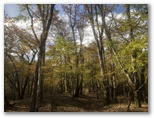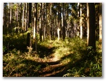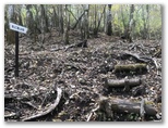 10時丁度、車道に出ました。斜め向かいに登山歩道が続いています。歩いてきた道を指す「須山口下山歩道」の標識にも初めて気づきました。腕木の先が赤く塗られているので、はっきり登山歩道と区別できます。以後、登山歩道と下山歩道の2標識を、ほぼセットで見ることになります。この車道を越えると、苔に覆われた平地があり、動物の糞尿のような臭いがしました。その後、未舗装の林道(?)を少しだけ歩き、10時30分、ようやく杉林を抜け出ました。