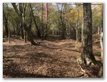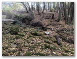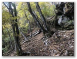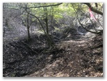 涸れ沢を越える個所がありました(1回目)。 水があれば、渡渉になります。対岸に上がると、コースが俄然ワイルドになりました。落ち葉の積もった斜面をトラバースしていくのです。この日は落ち葉がカサカサに乾いていましたが、雨後など葉が濡れているときは要注意でしょう。そんな道を15分ほど行くと、道が涸れ沢を渡り返していました(2回目)。ここは涸れ沢に下りる階段があるのですが、下部で崩落しています。
