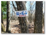 このまま楽々と鈴ヶ尾山頂に行けるといいな、と思っていたら、突然道が切れ落ちていました。慎重に下って、登り返します。尾根が再び平坦になると、山頂広場に出ました。真っ赤なモミジが見えます。すごい! でも鑑賞は後ですることにし、山頂に直行! 足が舞い上がるように軽くなり、今度こそ楽々と山頂に至りました。山名標が、杭を含めて三つありますが、いずれも「鈴ヶ尾山」です。杭には(大秋日山)とも書かれていました。開放感のある、すてきな山頂です。