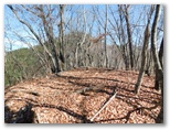 さて、その専用林道で(新)突坂峠に行けるのですが、そのやや手前で左手の(旧)突坂峠に上がりました。石仏の前に出ます。お地蔵ではありません。峠なので、おそらく馬頭観音像でしょうか。表敬をして、その背後の尾根に取り付きました。ところが落ち葉が厚く積もっていて、踏み跡が見えず、勾配も強いので下りでは難儀するかもしれません。どこかで頑丈な杖を調達することにします。登りは問題ありません。登りきると、平坦でのどかそうな尾根が待っていました。